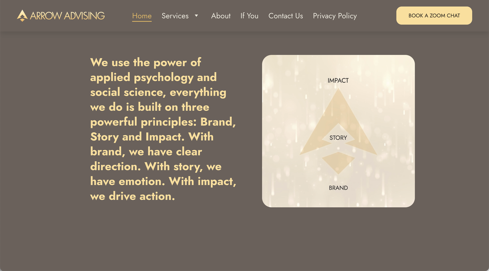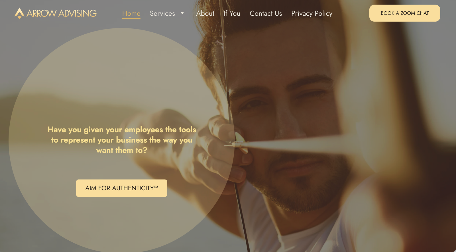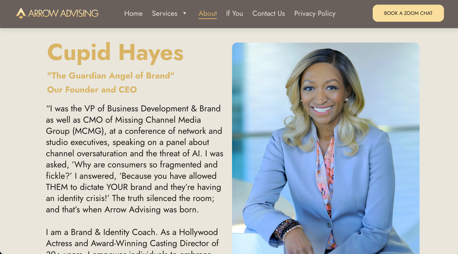 Designed for Arrow Advising — founded by Cupid Hayes, a Telly Award-Winning Hollywood Casting Director and Brand Strategist. Her Aim for Authenticity™ framework inspired a sleek, emotionally intelligent design.