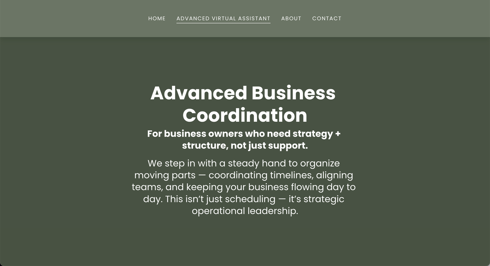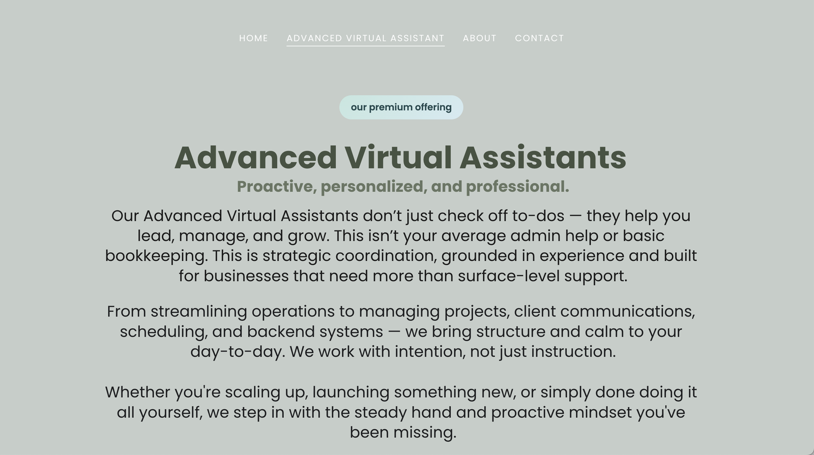 Virtual assistant agency bringing organization and clarity to businesses. I built a clean, trustworthy, and inclusive digital layout.